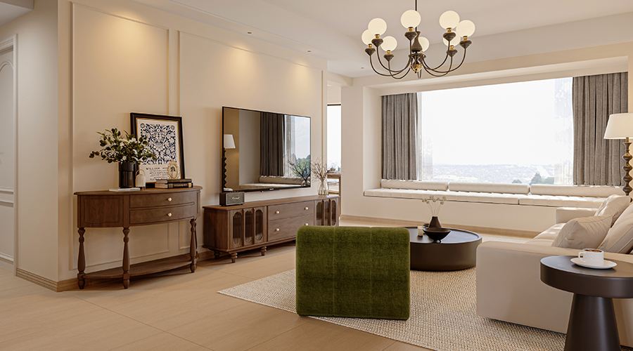 提取桂林山水的輪廓感與靜謐感,將其轉化為空間中的流暢線(xiàn)條與低飽和度主色調。意式輕奢中的理性與克制,恰好與東方的留白美學(xué)不謀而合,共同營(yíng)造出 “靜奢” 的氛圍。